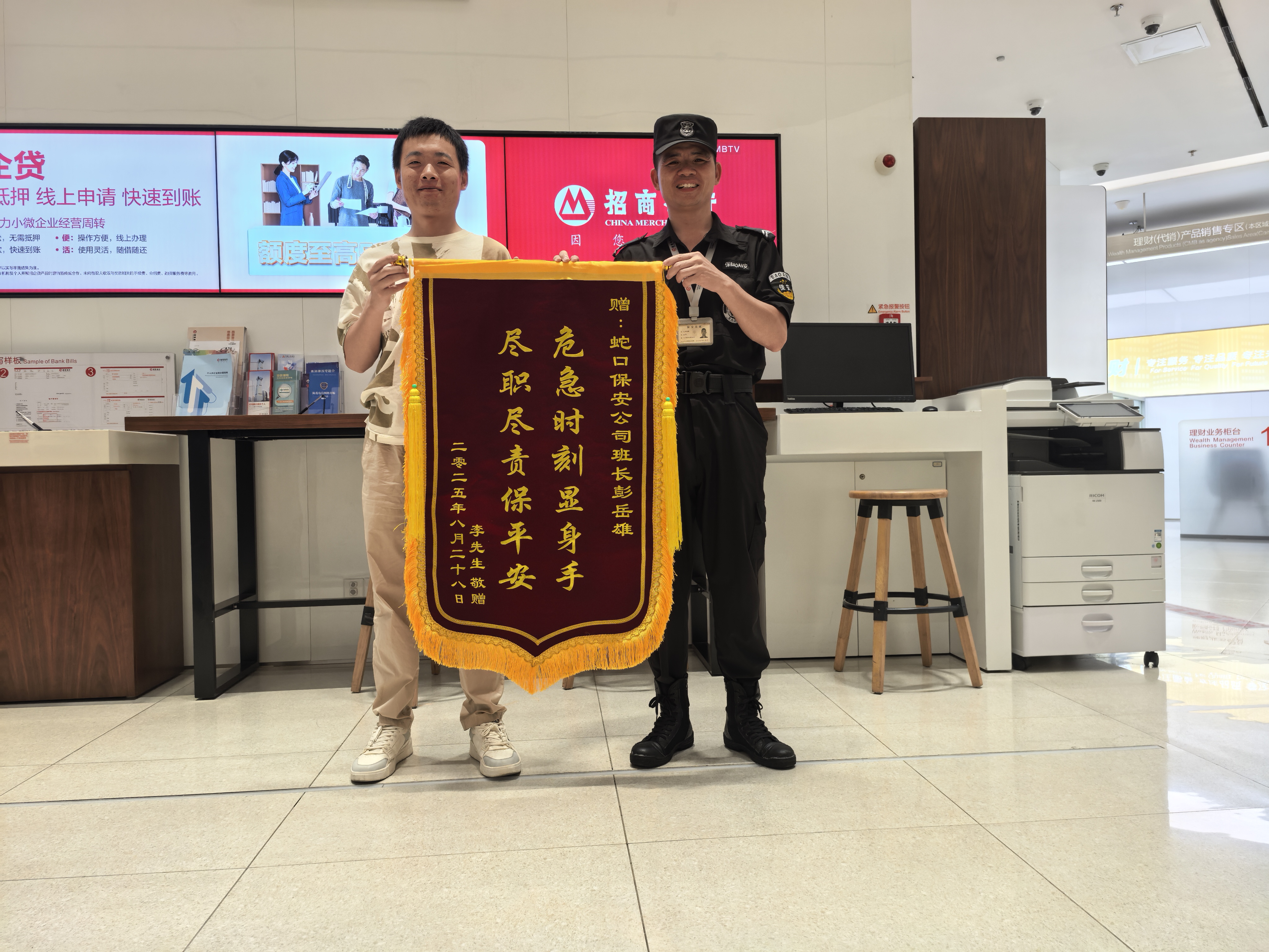 近日,我司派驻招商银行深圳西乡支行保安员彭岳雄飞身救护跌落的施工员,避免重大事故。获客户锦旗感谢及招行千元表彰,其英勇表现为公司赢得赞誉。8月23日晚8时,深圳西乡支行金葵花贵宾厅内,施工收尾工作正在