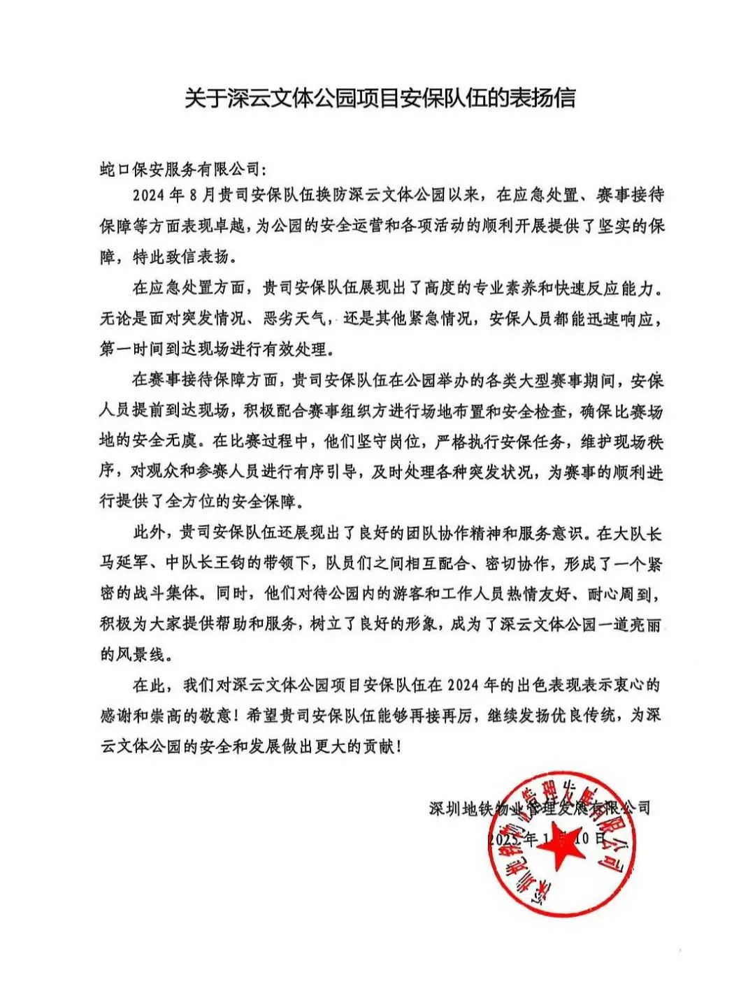 近日,公司收到来自深圳儿童医院发来的一封表扬信。2024年10月9日上午,深圳市儿童医院安检岗成功处置一名持啤酒瓶及刀具的闯入者,公司保安队反应迅速,确保了人员安全。2024年10月10日晚,深圳市儿
